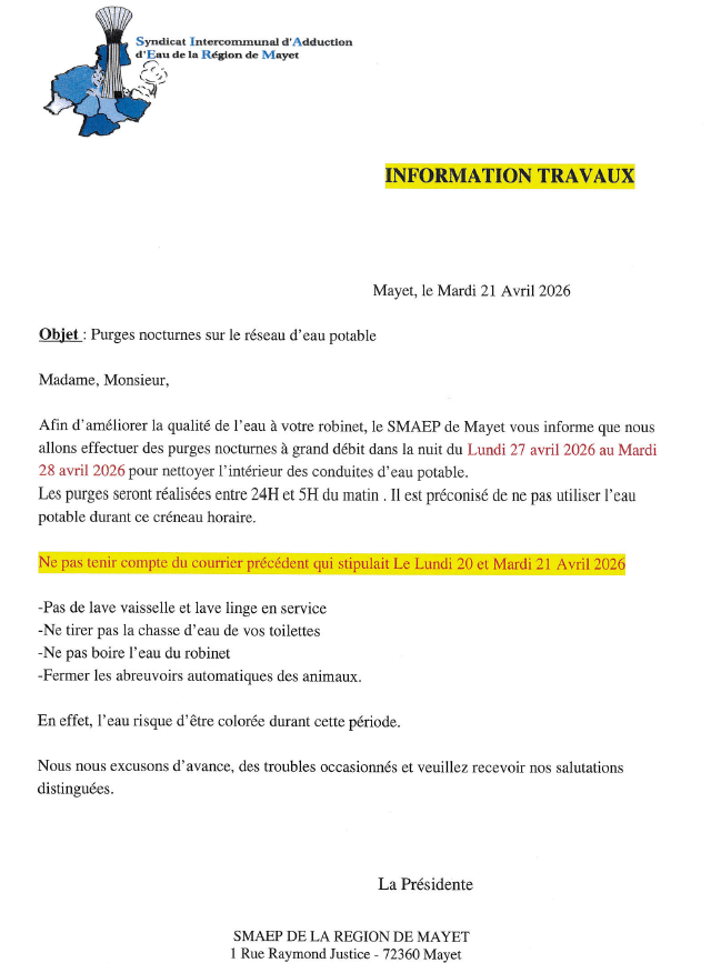 PURGES NOCTURNES RÉSEAUX D’EAU POTABLE – NUIT DU 27 AU 28 AVRIL 2026